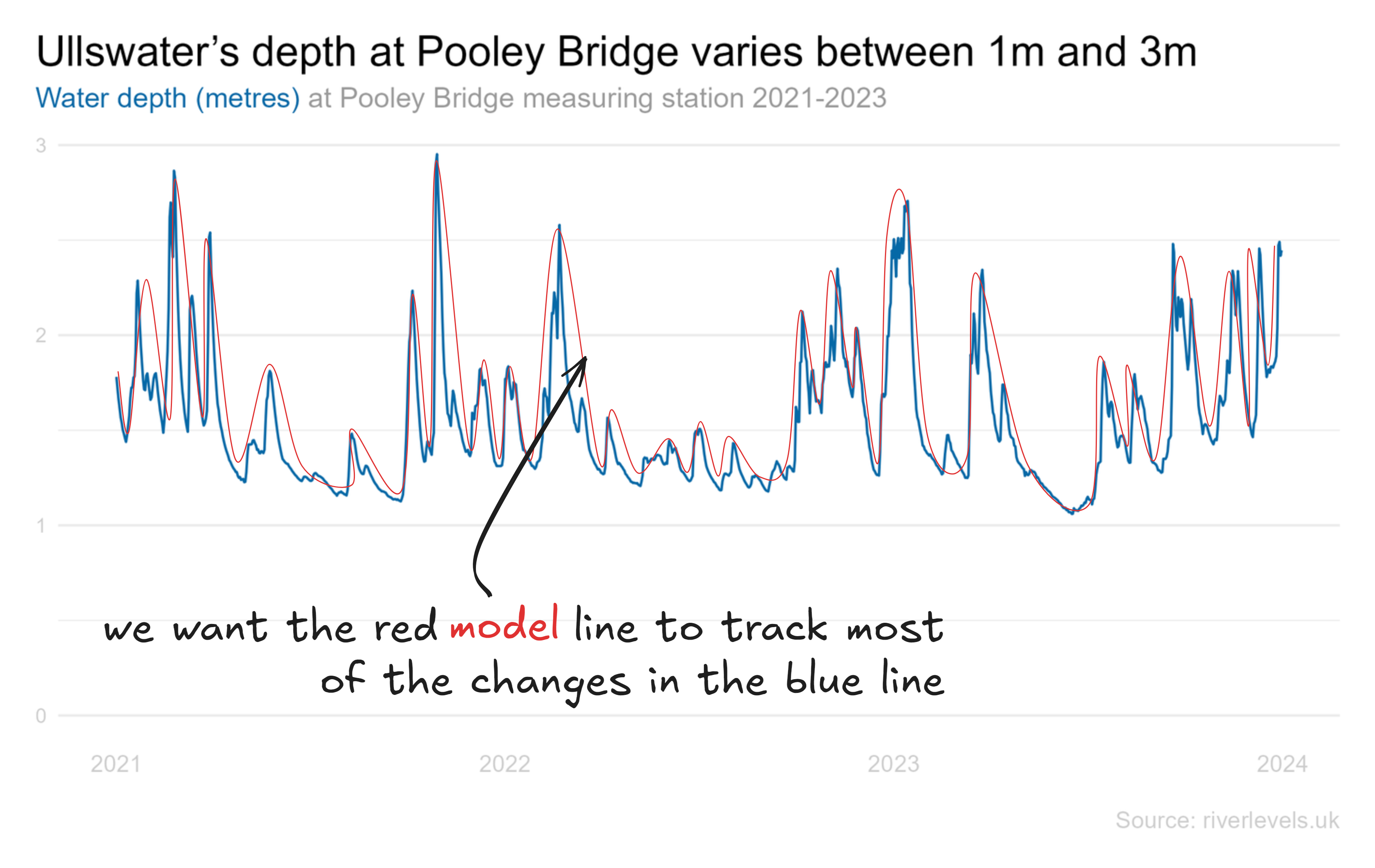 When our model works properly, it's able to explain why the water level has changed in the past. The blue line is the actual depth of the water and the red line is a sketch of roughly what we hope our model's shape might look like. If movements in the red model line mostly fit the shapes in the blue actual line (and you didn't cheat) then you've got a decent model that explains what's happened in the past. Some statisticians reading this are recoiling in horror but let's just say that 'and you didn't cheat' can get quite complicated and move on.