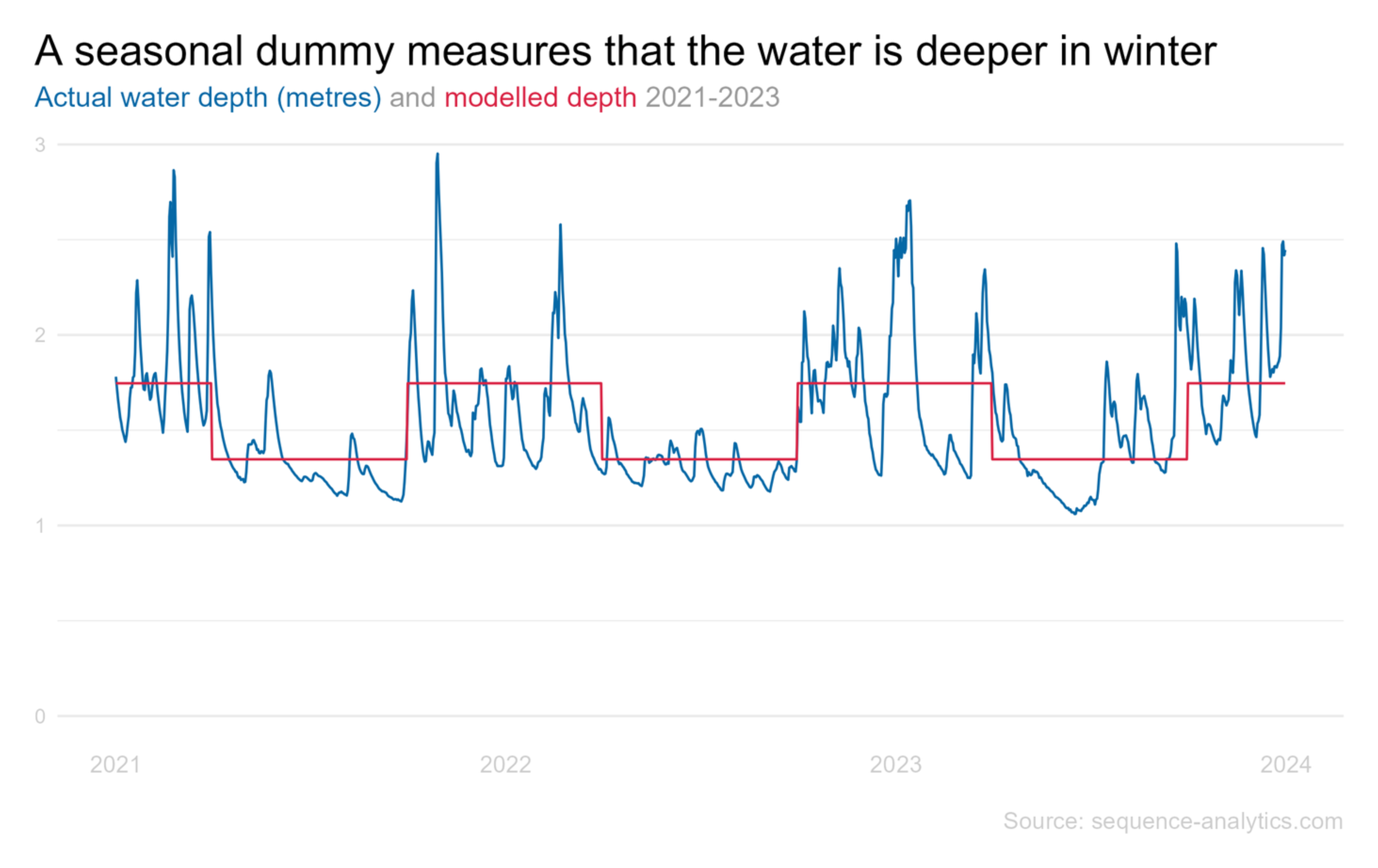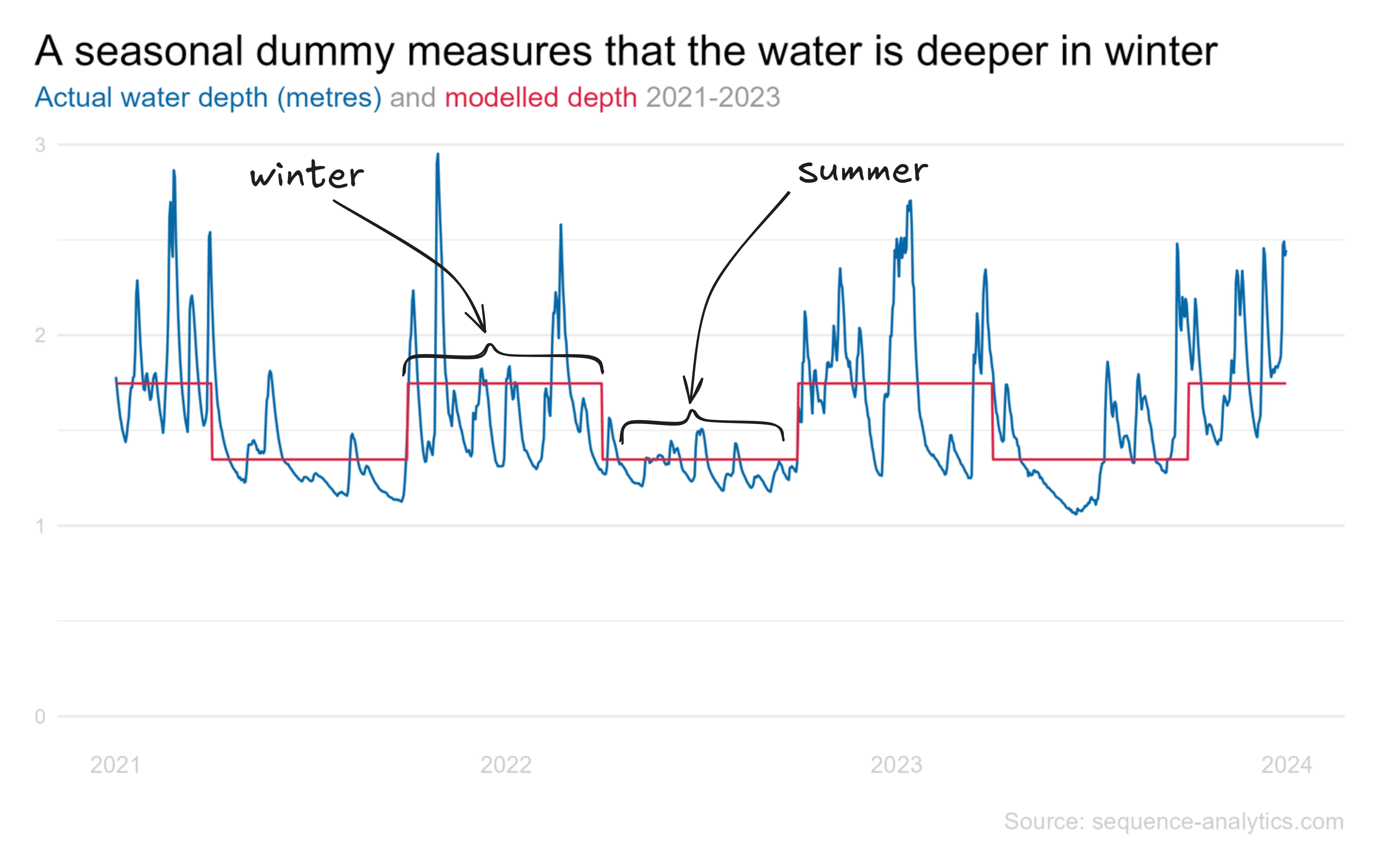 It's important to think about what we just did because we made a choice. We modelled that the water level is higher in winter 'just because'. Not because it's caused by anything that we've explained, it's higher in winter just because it is.