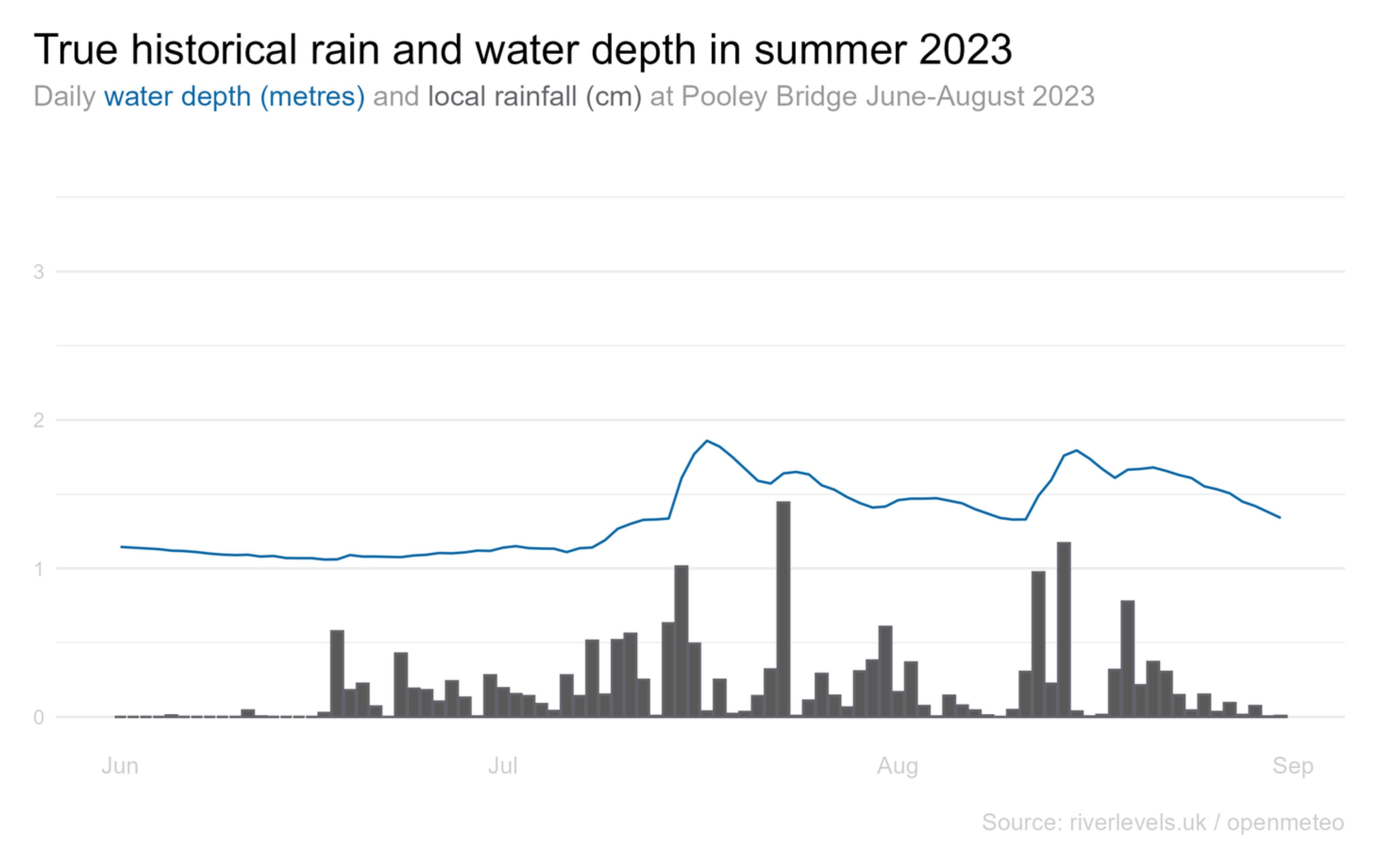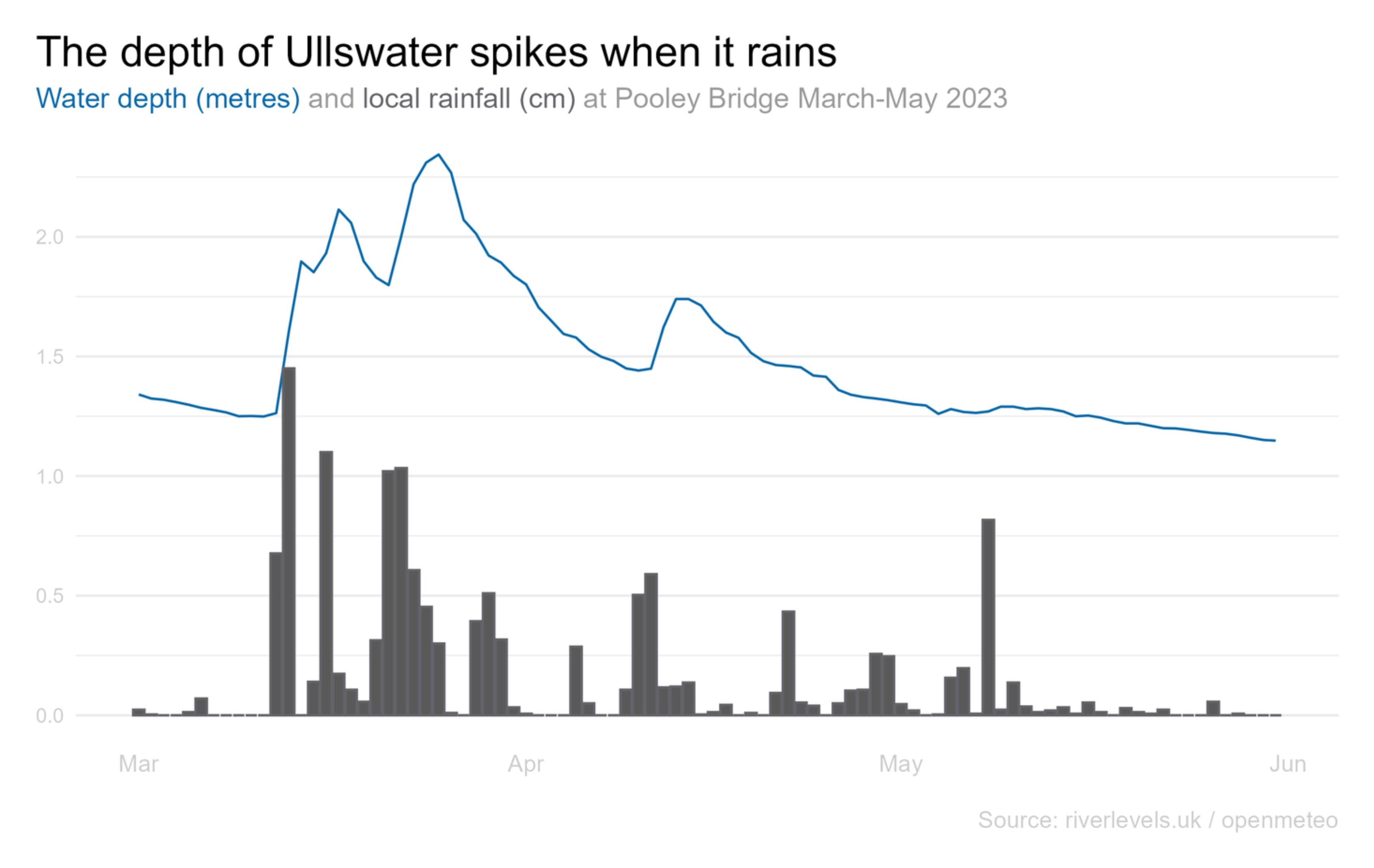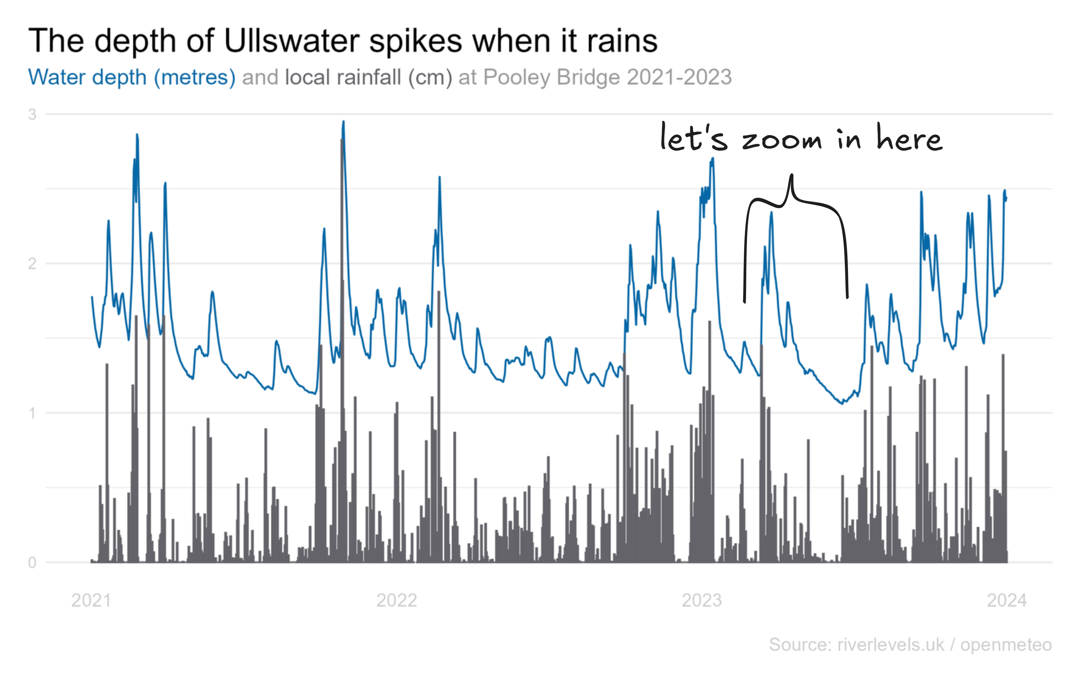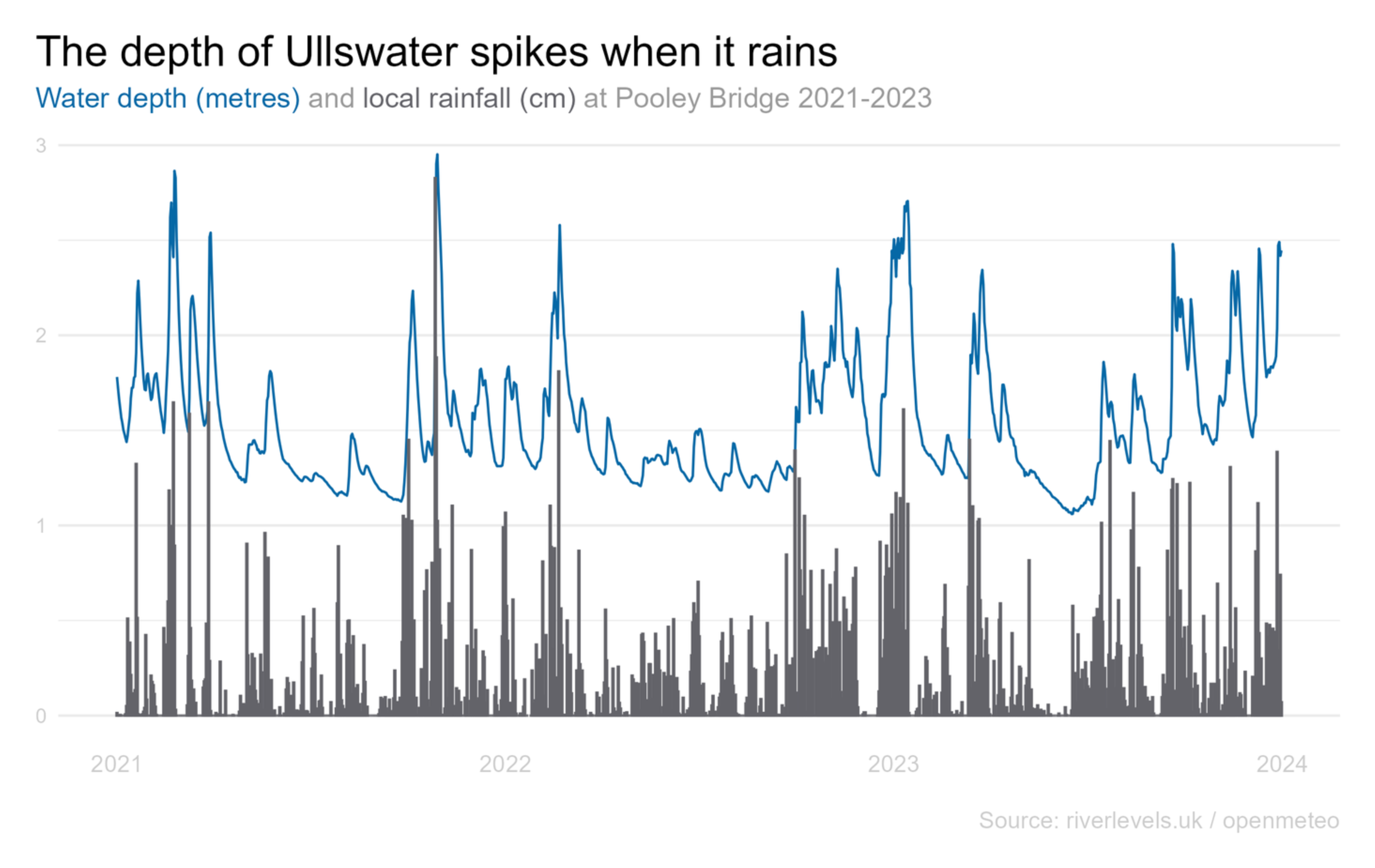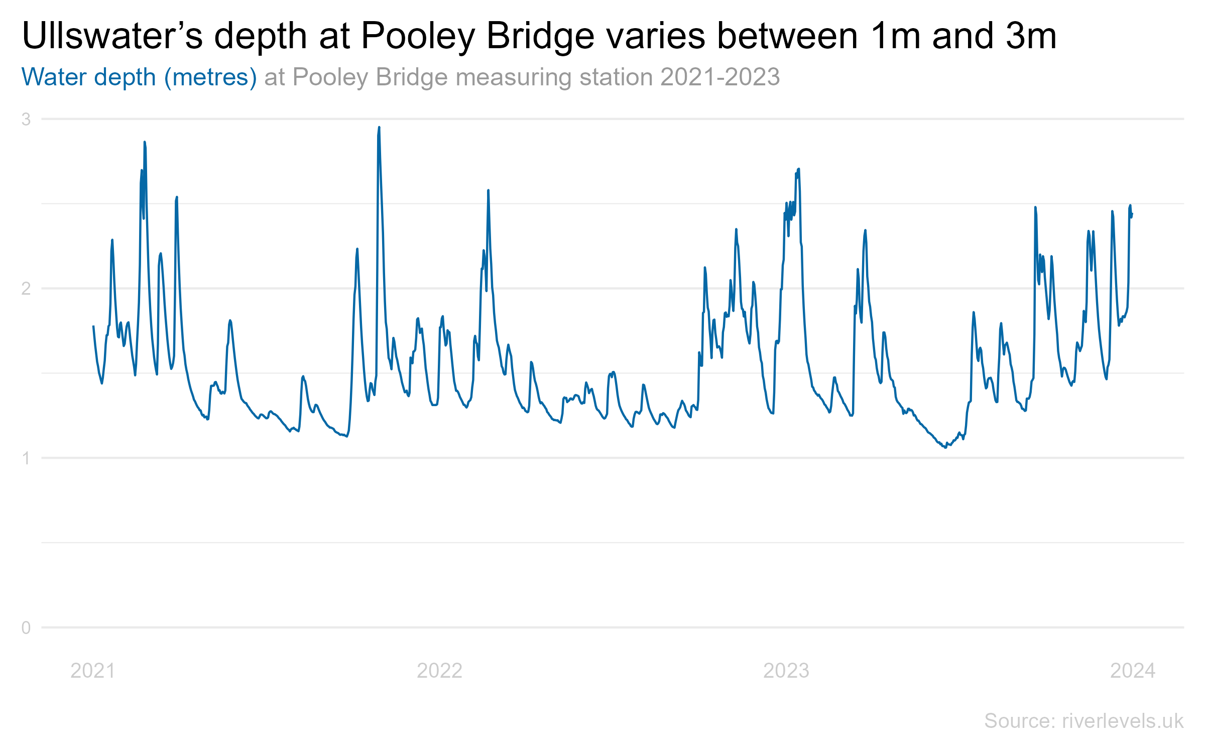 The depth of Ullswater at Pooley Bridge varies between around 1m and 3m and if you squint at this chart of its levels since 2021, doesn't it look a bit like the sales line for a brand that's running lots of promotions?