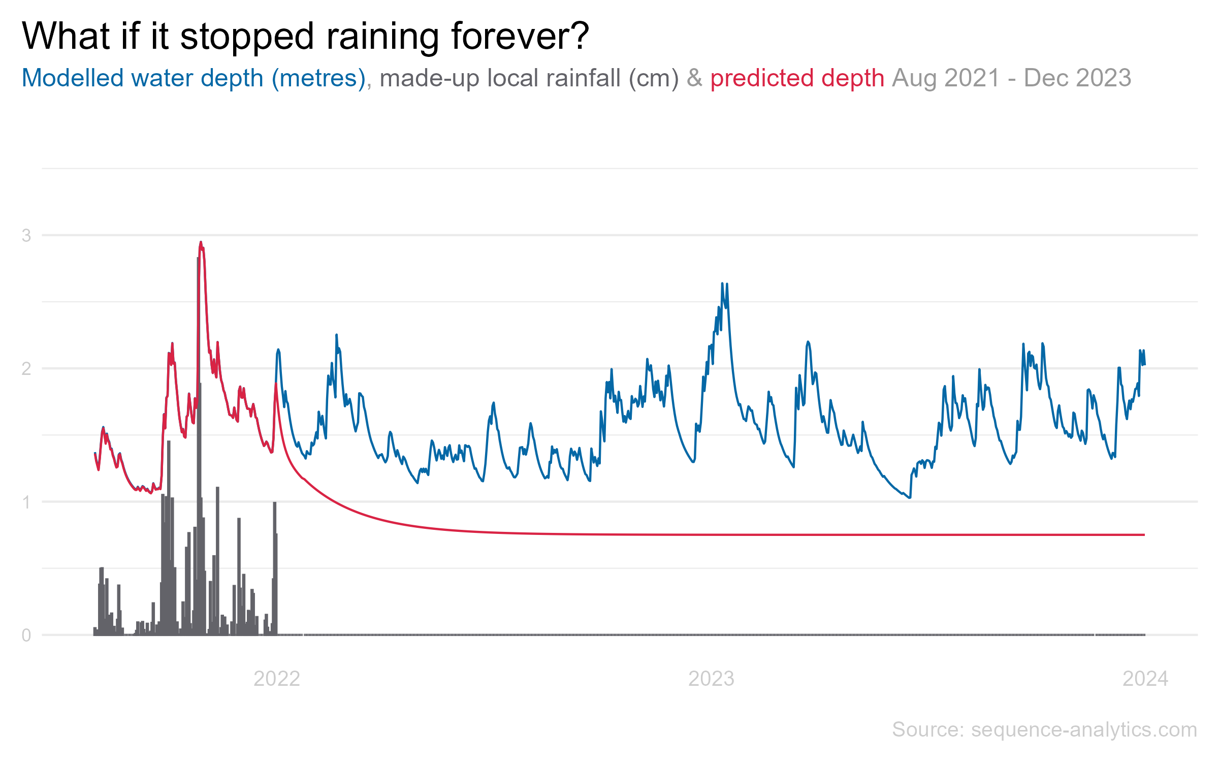 Our model says that if it never rains again, the water level will drop to 0.75m and stay there, never dropping any lower. It doesn't suggest any clues for where the 0.75m of water is coming from but it's not capable of forecasting that the water could drop below that level.