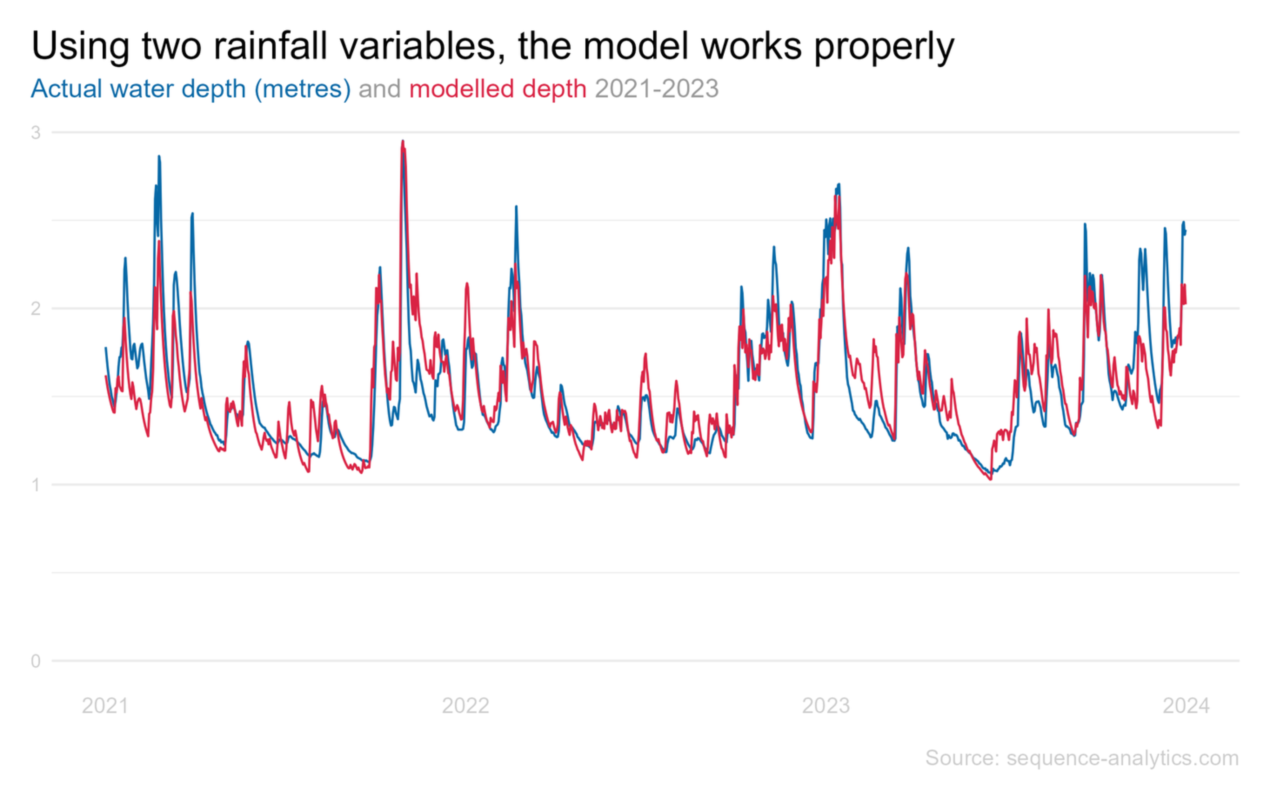 Who you commission to build your models is extremely important, as one analyst might measure that winter seasonality is causing the water depth to rise (and we should acknowledge that they wouldn't be strictly wrong in that statement) but another analyst - a better, more diligent analyst - would take the next step and use rainfall data instead of seasonality to make a much more useful model, like we will now.