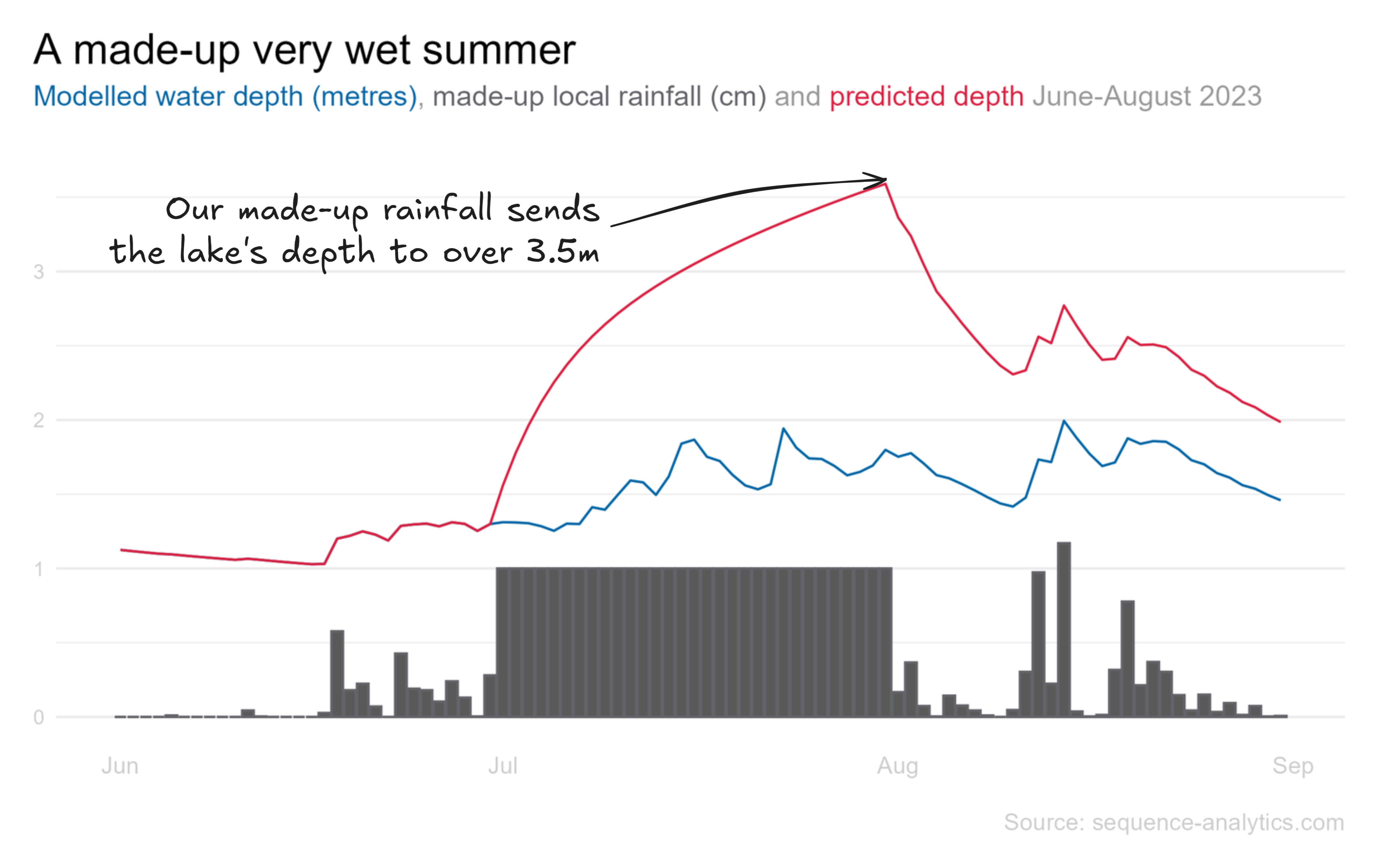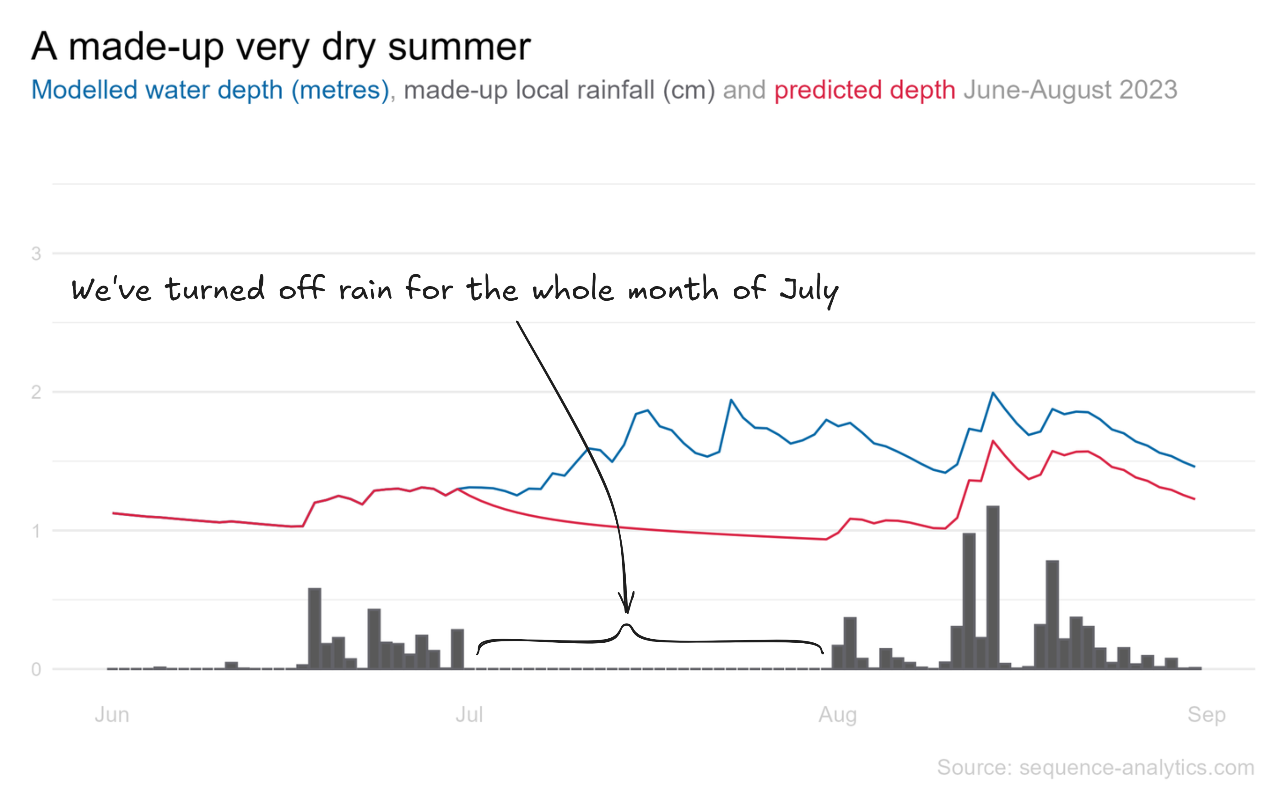 Our model can generate a new prediction that the water level would drop throughout July, hitting a level below 1 metre before it started to rain again in August. There would still be a lower water level for quite some time afterwards, due to the decay rates we saw earlier. A lack of rain now will have an impact into the future.