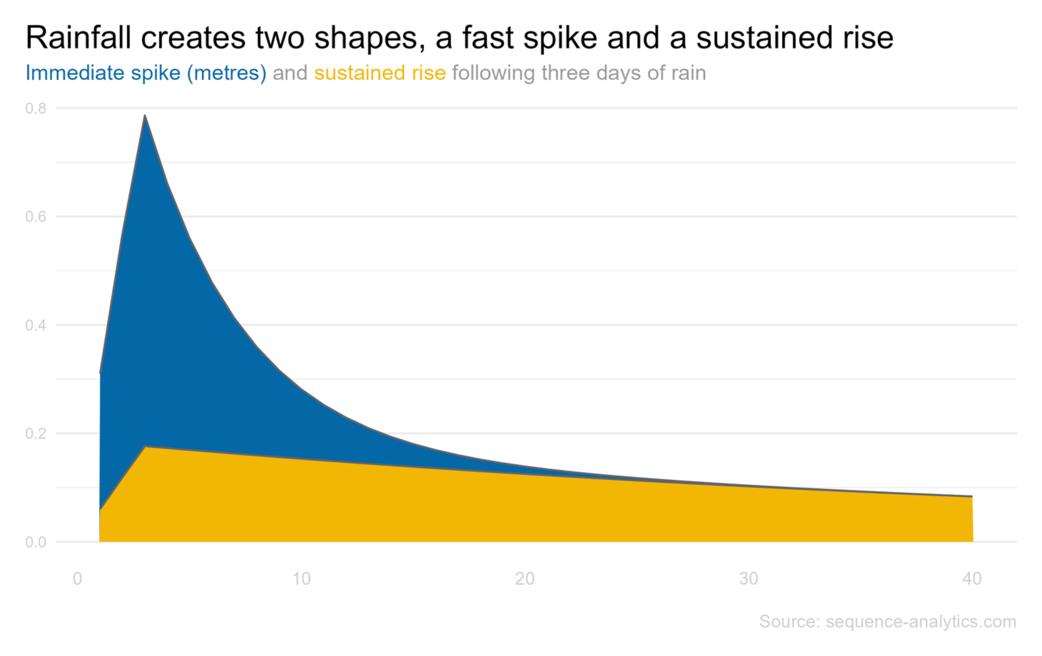 The shape that rain creates is an immediate spike in the depth of the water and a slower rise and fall that endures over a longer period of time.