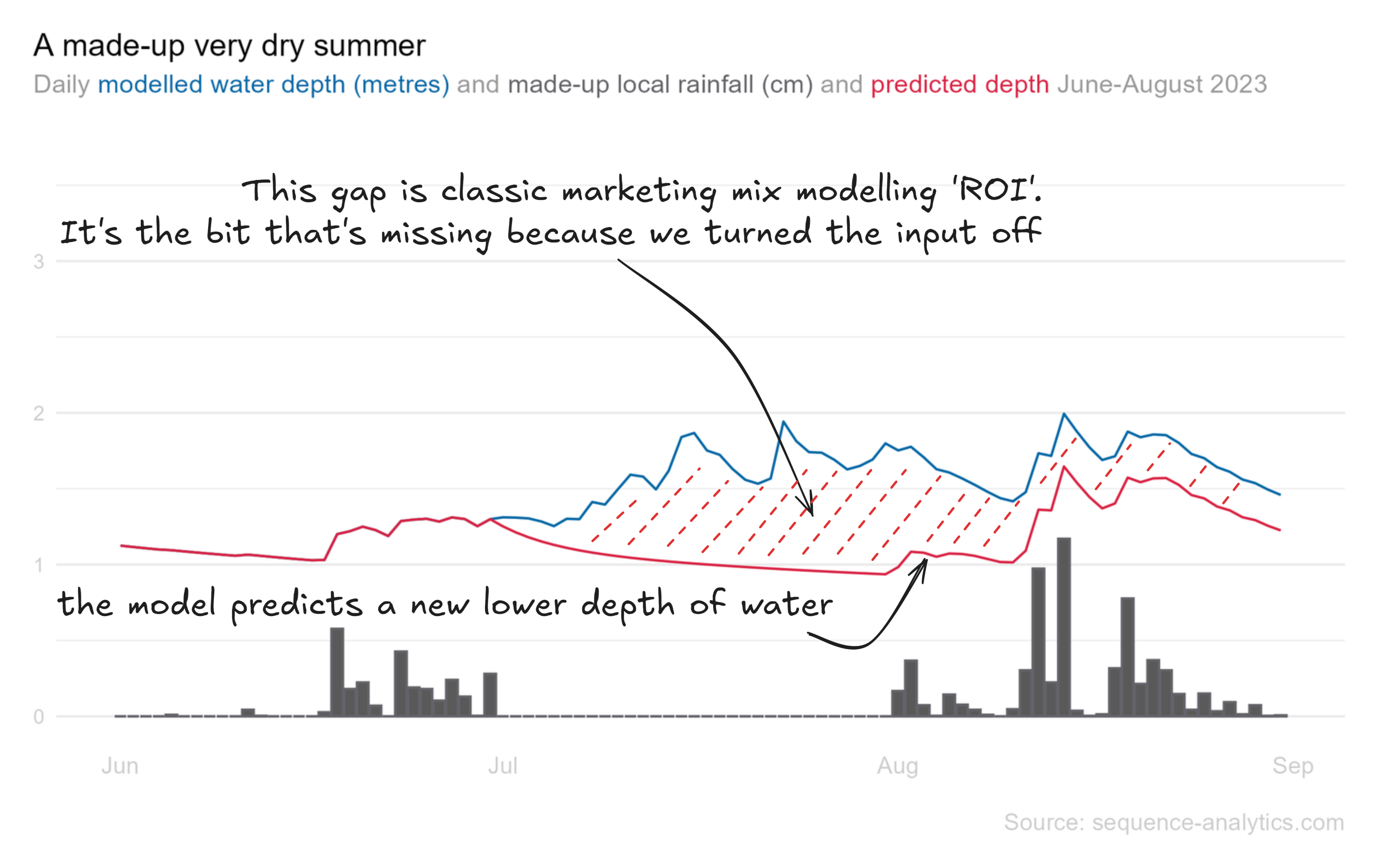 We're going to create a model to explain what's changing the depth of the water, in exactly the same way as an econometrician would build a model to explain what's driving the sales of a brand.